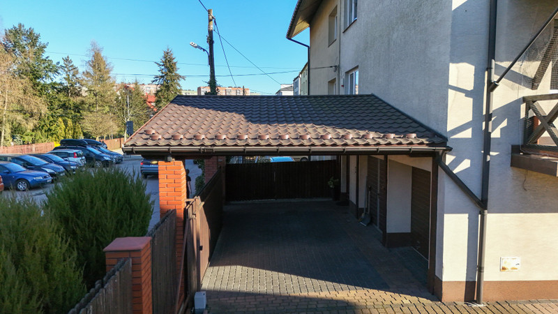 Działka około 500 m² - w większości wyłożona kostką brukową, z miejscami parkingowymi pod 2 wiatami (27 m² i 37 m²), które bez problemu pomieszczą auta typu Renault Master.