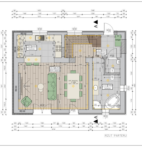 Przestronny salon z wyjściem na taras - (okna 2 skrzydłowe tarasowe + drzwi balkonowe jednoskrzydłowe) z aneksem kuchennym (możliwość stworzenia oddzielnej kuchni),