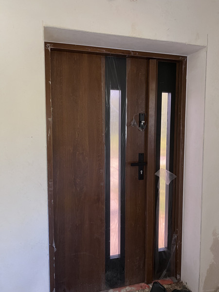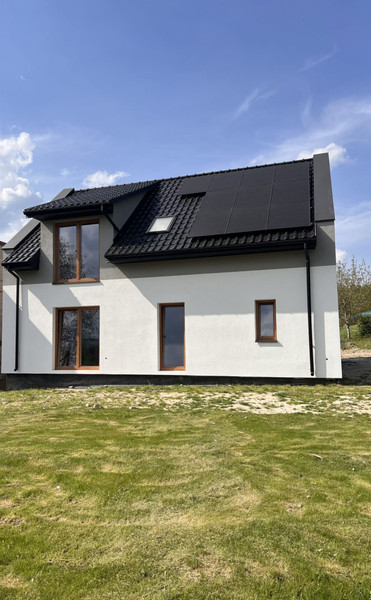 Zrobione wylewki oraz tynki maszynowe, dach ocieplony pianą, okna 3-szybowe, drzwi zewnętrze 2-skrzydłowe antywłamaniowe, pełna elewacja oraz ocieplenie 20cm grafit, dachówka ceramiczna czarny połysk, panele fotowoltaiczne wraz z osprzętem.