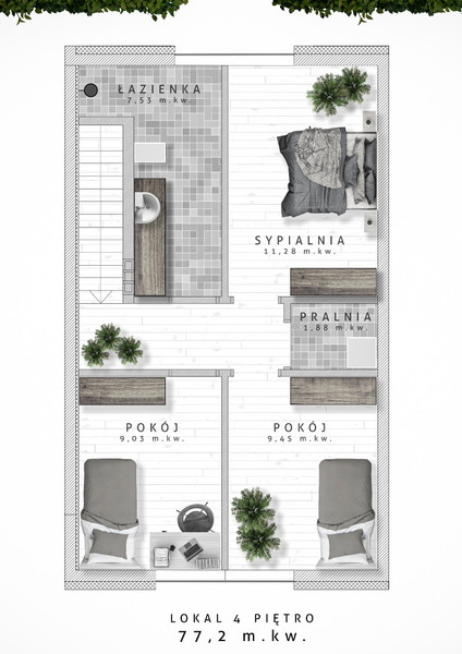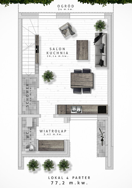 Na parterze: wiatrołap, ubikacja, schowek, salon z kuchnią na otwartym planie oraz nieduży ale wystarczający ogórdek (ok 70m2) który pozwoli na stworzenie idealnej strefy relaksu.