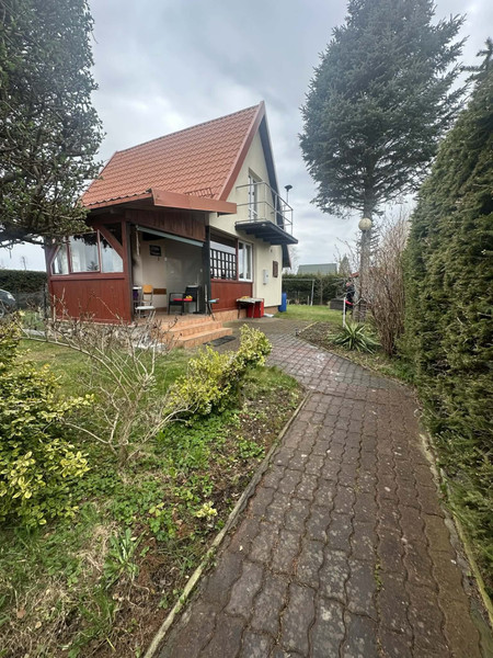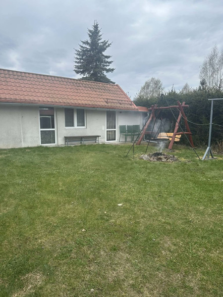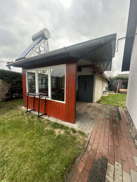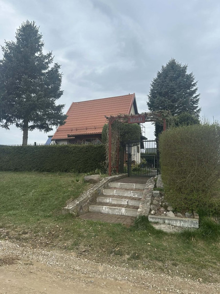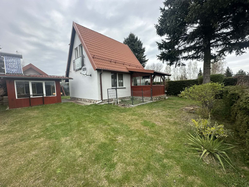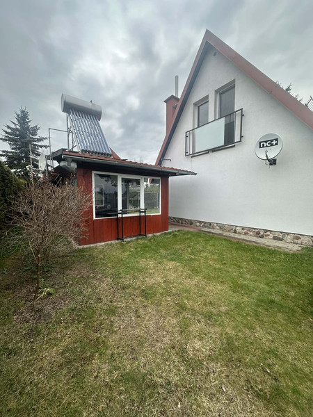 Parter: salon z aneksem kuchennym i kominkiem, łazienka, mała piwnica, oszklony taras. Piętro: dwa pokoje z balkonem. Ciepła woda użytkowa podgrzewana przez kolektor słoneczny — od wiosny do jesieni praktycznie darmowa, a gdy słońca brakuje, automatycznie dogrzewa bojler elektryczny. Dom nadaje się do całorocznego mieszkania — nie trzeba zakręcać wody na zimę, nie trzeba się przenosić we wrześniu.