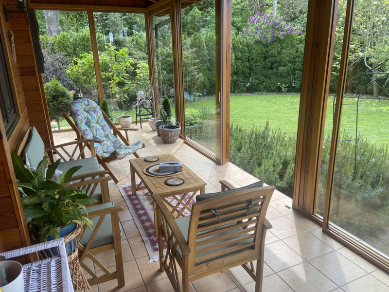 Dom otacza piękna, przeszklona oranżeria, która pozwala cieszyć się tarasem niezależnie od pogody – idealne miejsce na poranną kawę, odpoczynek lub spotkania z bliskimi.