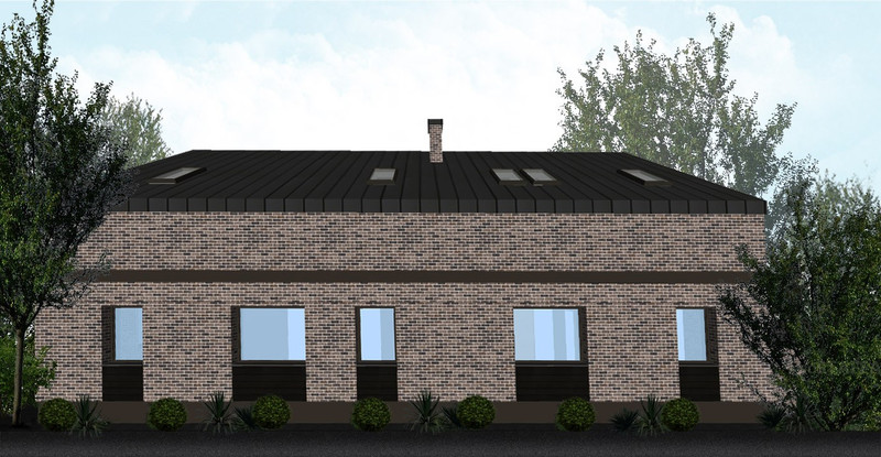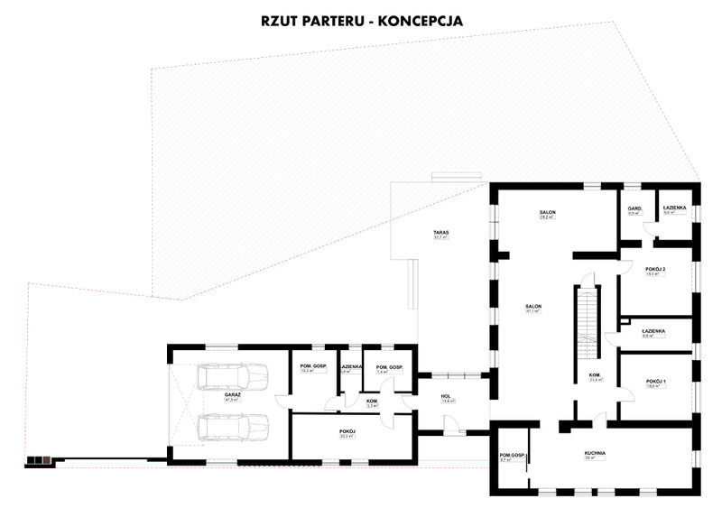 Załączone rzuty parteru i piętra wizualizują nowoczesny dom z salonem, pokojami, kuchnią, łazienkami, garażem i holem – elegancka bryła ceglana z zielonymi akcentami. Rozkład optymalizuje przestrzeń (antresola, niezależne strefy), umożliwiając dwa mieszkania lub dom rodzinny o wysokiej wartości po remoncie.