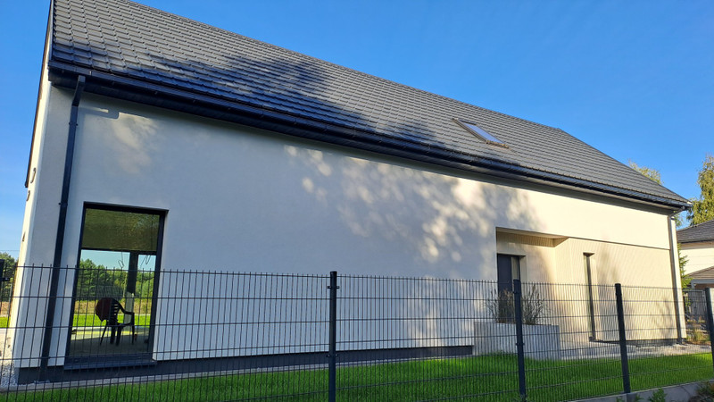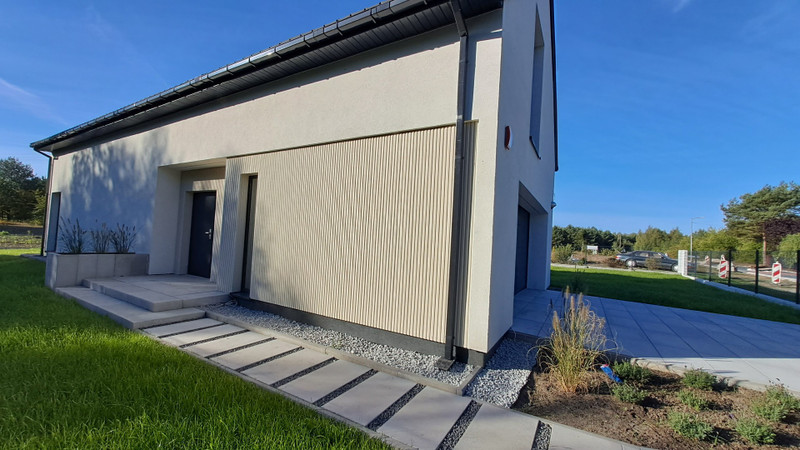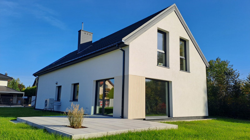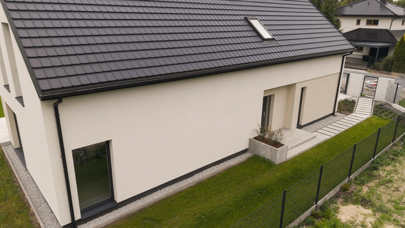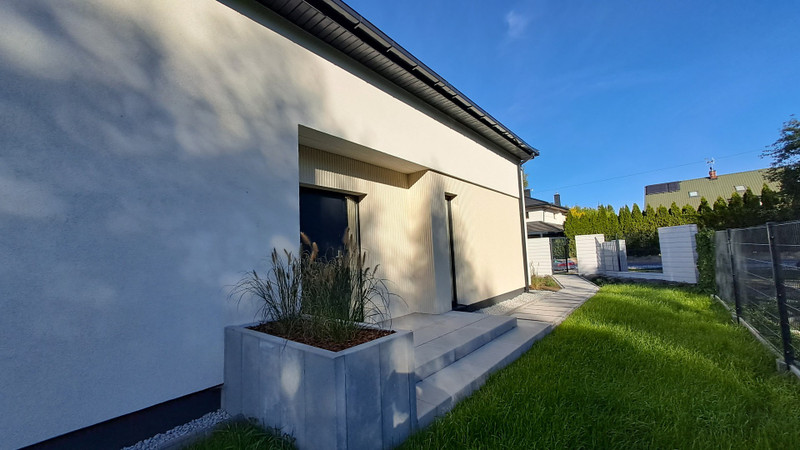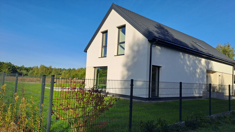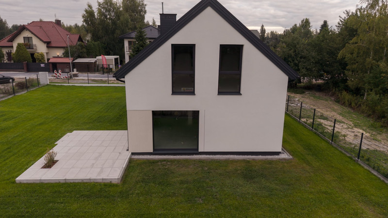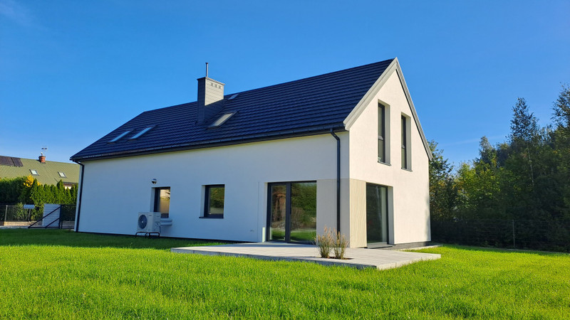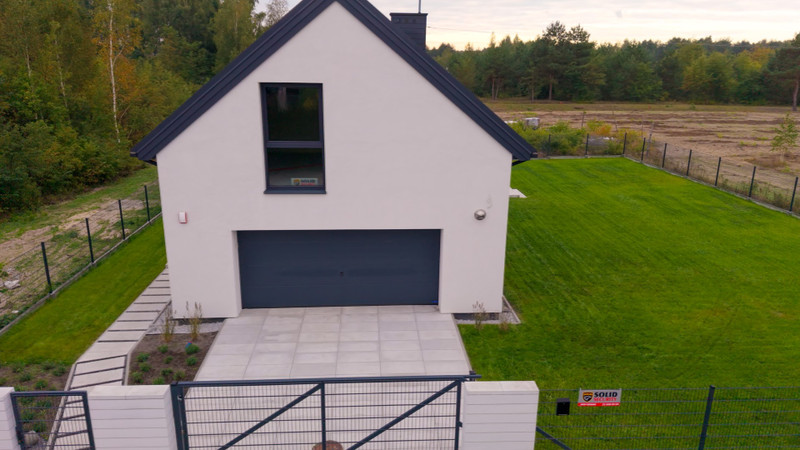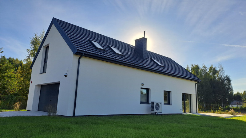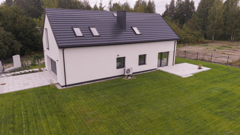 Dom wyposażony jest w pompę ciepła marki York, a w całym budynku wykonano ogrzewanie podłogowe. Zastosowano okna panoramiczne oraz połaciowe marki Roto, które zapewniają idealne doświetlenie wnętrz, drzwi wejściowe marki Wikęd oraz bramę garażową Hormann. Na zewnątrz wykonano oświetlenie LED, a całość dopełnia system monitoringu. Wszystkie media mają charakter miejski, dzięki czemu nieruchomość jest wygodna w użytkowaniu i nie wymaga dodatkowej obsługi.