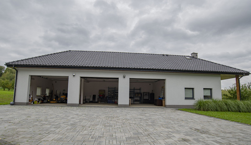 · Garaż trzystanowiskowy + pomieszczenie socjalne: 145 m² + 48 m² (pokój, kuchnia, łazienka z wyjściem na taras)