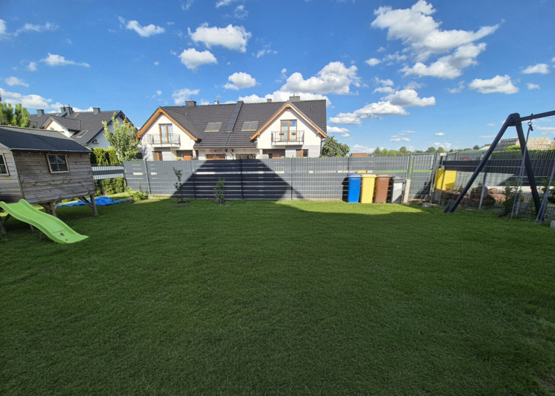 Zadbany trawnik z drzewami owocowymi (jabłoń, brzoskwinia, morela) – idealne miejsce na poranne kawy, rodzinne grillowanie i zabawę dzieci