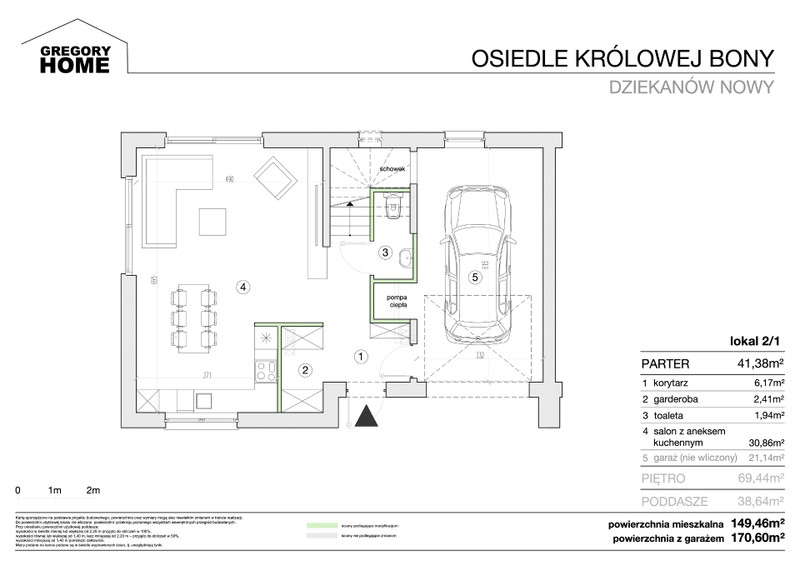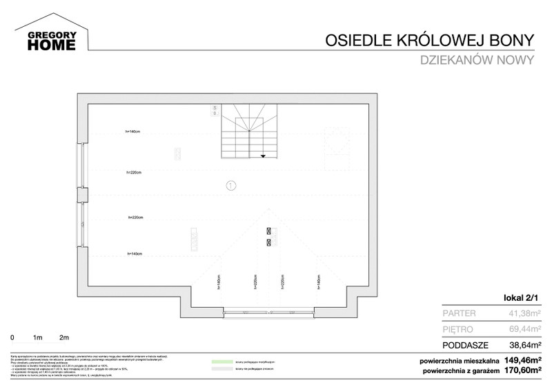 Domy zostały zaprojektowane o powierzchni użytkowej z garażami w przedziale od około 140 do około 172 metra kwadratowego. Każdy z lokali na parterze będzie posiadał salon z aneksem kuchennym, łazienkę z prysznicem, garderobę, korytarz i garaż. Na piętrze znajdziemy w każdym z lokali trzy lub cztery sypialnie, jedną lub dwie łazienki, oddzielne pomieszczenie techniczne z przeznaczeniem dla pompy ciepła, pralki i suszarki. Na poddaszu zaprojektowano duży pokój i co ważne z oknami w ścianach szczytowych i frontowych, aby nie było konieczności montażu okien połaciowych które mogłyby ograniczać montaż paneli fotowoltaicznych na dachu.