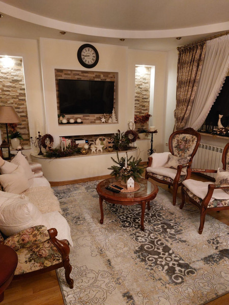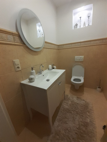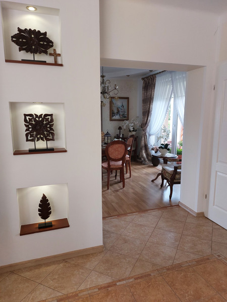 2) Parteru: duży hol, przestronny salon, aneks kuchenny z pełnym wyposażeniem oraz zabudową wykonaną na zamówienie, toaleta wyposażona w umywalkę oraz WC, wyjście z salonu na zadaszony taras z zejściem do zagospodarowanego ogrodu;