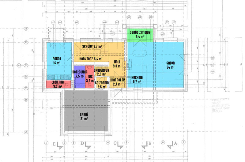 Dom z roku 2006. Ściana trójwarstwowa - pustaki ceramiczne. Dachówka ceramiczna Roben w kolorze zieleni butelkowej. Podłogi – gres, parkiet przemysłowy (wenge, jatoba) i panele. Ogrzewanie gazowe (piec kondensacyjny Wolf), w strefie dziennej głównie podłogowe, w nocnej – grzejniki. Okna plastikowe.