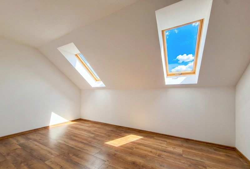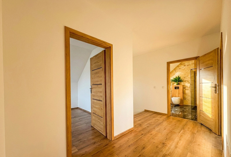 Piętro mieści trzy pokoje, w tym sypialnię z wydzieloną garderobą, oraz dużą łazienkę wyposażoną zarówno w wannę, jak i prysznic. Do dyspozycji jest również strych pełniący funkcję dodatkowej przestrzeni do przechowywania.
