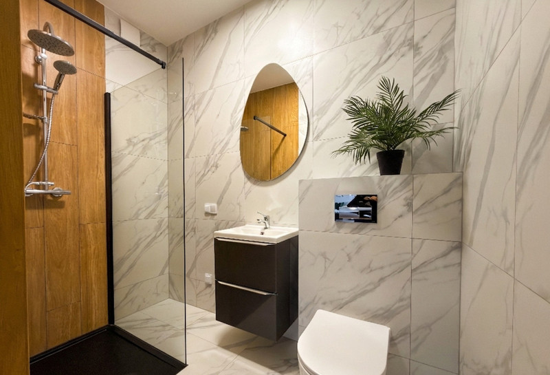 Ogrzewanie i instalacje Dom ogrzewany pompą ciepła Rotenso 8 kW w klasie energetycznej A+++ z zasobnikiem ciepłej wody 260 l i cyrkulacją ciepła woda natychmiast w każdym punkcie. Instalacja fotowoltaiczna 4,2 kW obniża rachunki za prąd niemal do zera, z możliwością rozbudowy na życzenie. Każde pomieszczenie posiada osobny obieg grzewczy z termostatem. Przygotowane instalacje pod klimatyzację, monitoring i alarm – wystarczy podłączyć urządzenia.