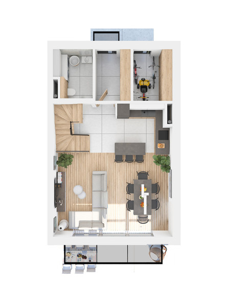 - parter - wiatrołap, salon z kuchnią, łazienka/węzeł techniczny, schowek gospodarczy, wyjście do ogródka