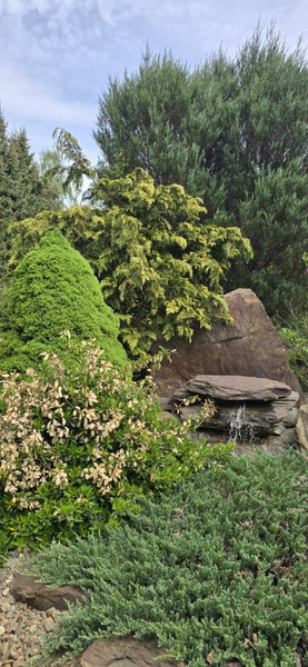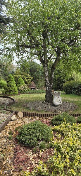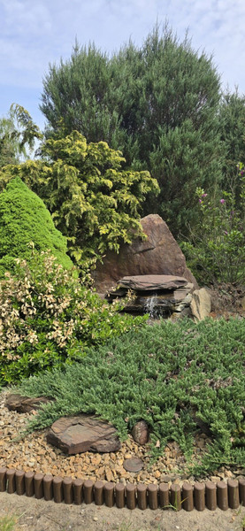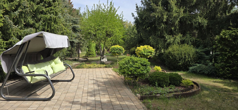 Powierzchnia działko to aż 1370m2, dużą część zajmuje piękny, zadbany ogród z automatycznym podlewaniem. Na terenie ogrodu altana, skalniak z fontanną. Woda wykorzystywana do podlewania ogrodu pobierana ze studni głębinowej.