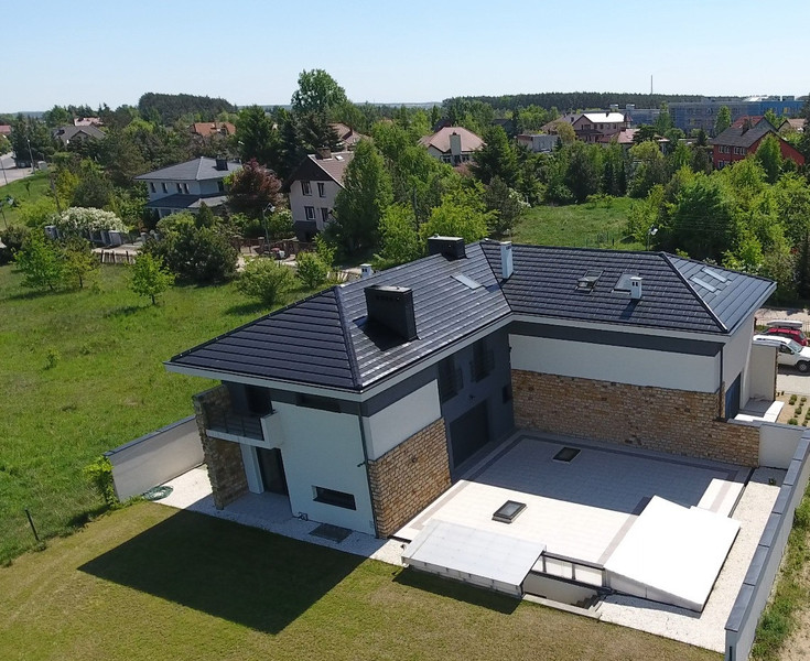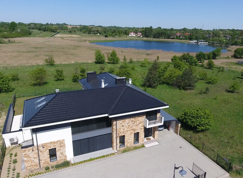 Pokrycie dachu czarna dachówka.