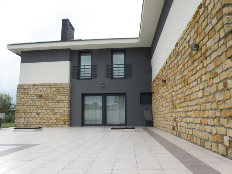 Unikalna elewacja z łupanego piaskowca nadaje nowoczesnej bryle skojarzeń z architekturą śródziemnomorską.