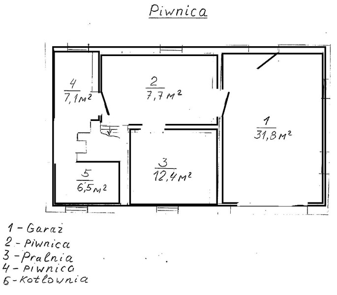 W przyziemiu (wysokość 2,1 m) garaż (31,8 m2) oraz pomieszczenia gospodarcze (33,7 m2): m.in. kotłownia, pralnia, piwnica, suszarnia.