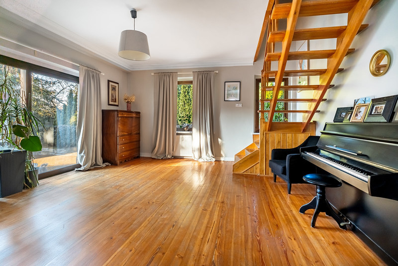Na parterze znajduje się przestronny jasny salon połączony z jadalnią, oddzielna kuchnia,, pokój z wyjściem na ogród oraz łazienka.