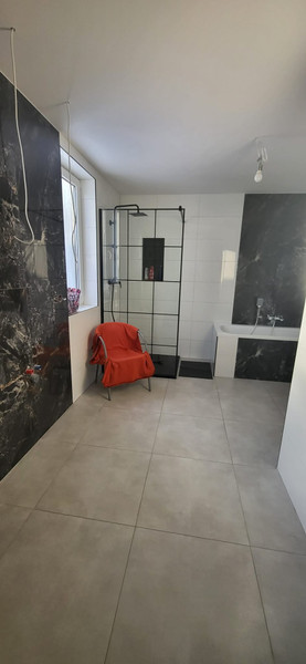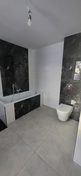 Łazienka oraz osobna toaleta są już wykonane. Cały dół domu został pomalowany farbą podkładową, co stanowi gotową bazę pod malowanie docelowym kolorem według własnej aranżacji.