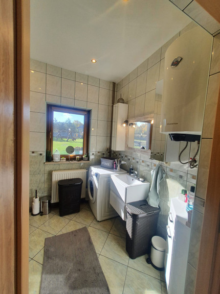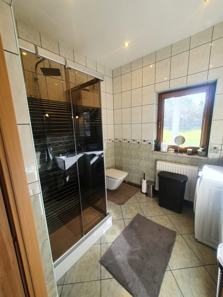 • Parter: kuchnia z jadalnią, przestronny salon, gabinet/pokój biurowy, łazienka z prysznicem i WC, kotłownia z przejściem do garażu (obecnie przerobionego na salon kosmetyczny), wyjście na taras.