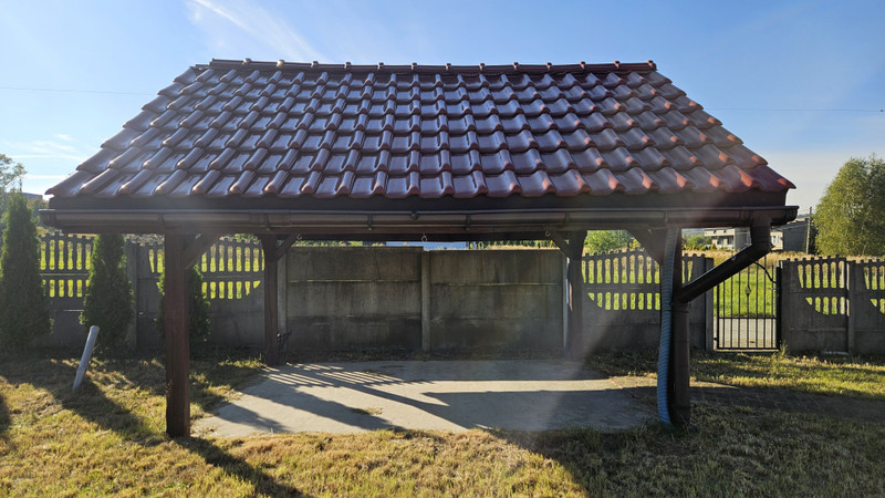 Dach pokryty jest piękną czerwoną dachówką ceramiczną, taką samą jak na mniejszym domu i altanie.