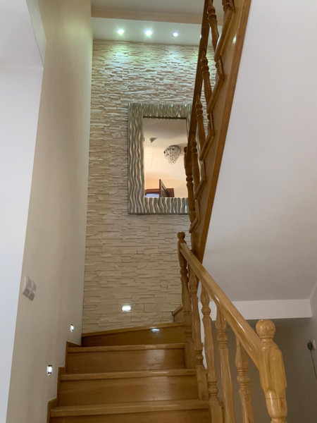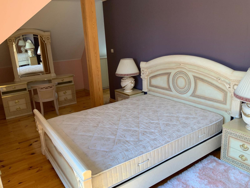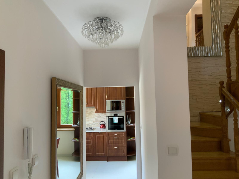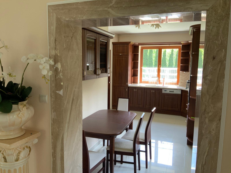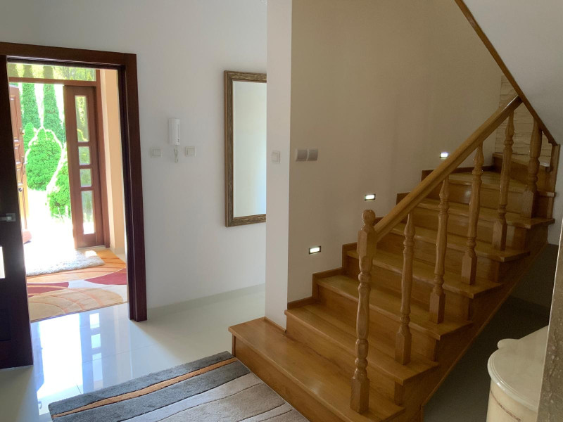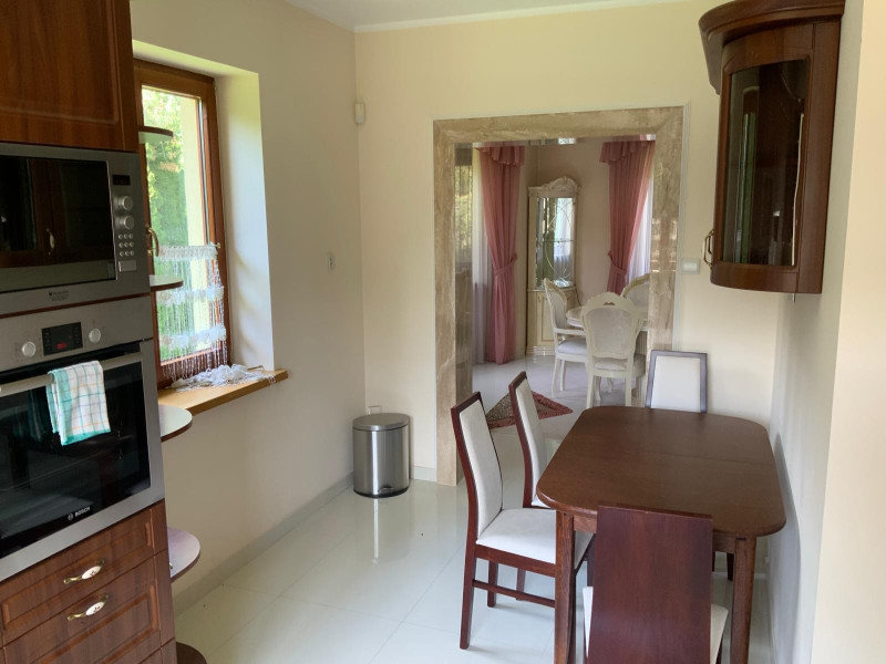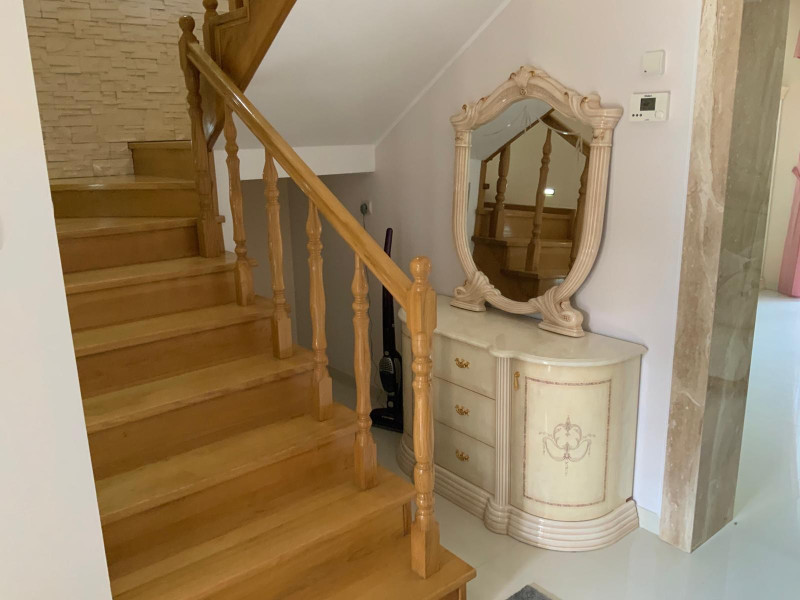 Dom na dole posiada salon dużą kuchnię łazienkę i pomieszczenie, pralni, prasowalni i oczywiście duży hol,natomiast na górze 3 sypialnie i duża łazienka.