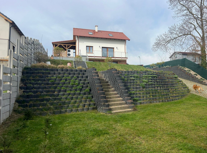 Dom posadowiony jest na działce o powierzchni 1130 m². Na terenie znajduje się wiata garażowa oraz dodatkowe miejsca parkingowe. Istnieje również możliwość wjazdu na dolną część działki przez bramę sterowaną pilotem.
