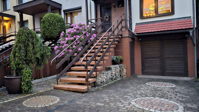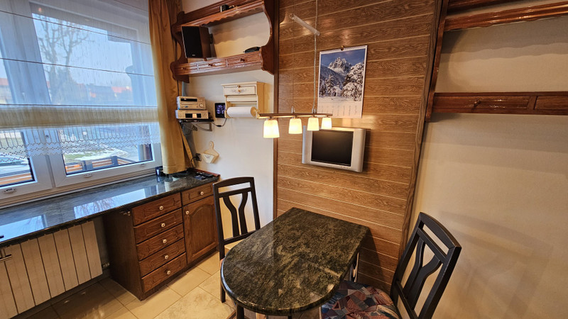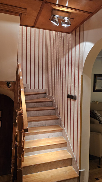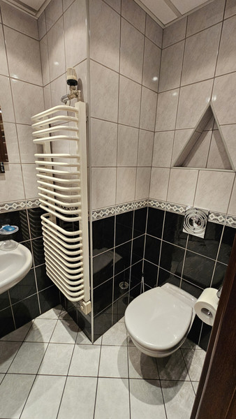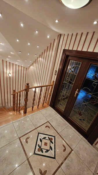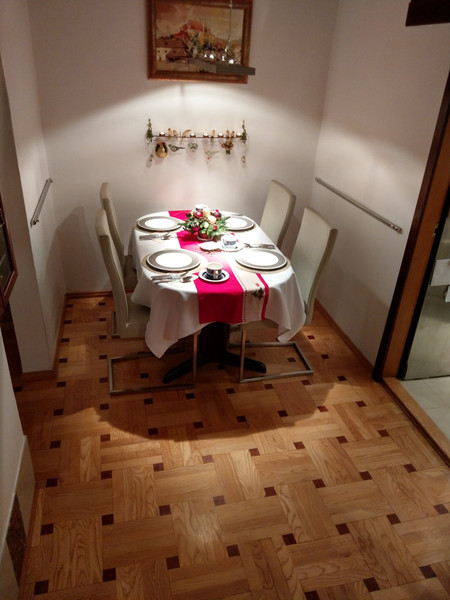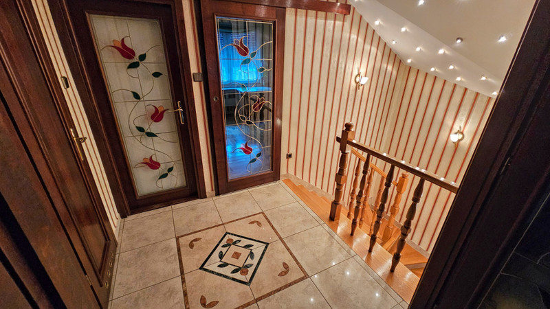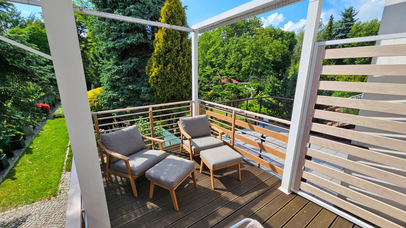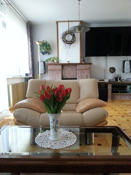 Dom był wielokrotnie modernizowany i upiększany. Z dużą starannością (i wg nas gustownie) wykończony wewnątrz i na zewnątrz. Na wysokim parterze duży salon, z przyległym tarasem z drewna egzotycznego (taras na poziomie salonu, dobudowany 2 lata temu), nowoczesną kuchnią i aneksem jadalnym. Na górnym piętrze trzy pokoje: 1 duży wielkości salonu na dole i 2 mniejsze.