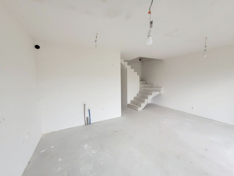 • Parter: salon z aneksem kuchennym i wyjściem do ogródka (~24 m²), garaż, wiatrołap, WC/pralnia.