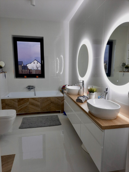 Elegancka łazienka – wanna, duży prysznic typu walk-in, dwie umywalki