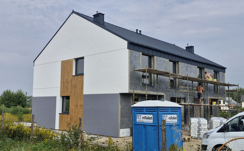- elewacja budynku w technologii lekkiej-mokrej, w części nadziemnej ściany ocieplone styropianem, w części podziemnej i przyziemiu styrodurem