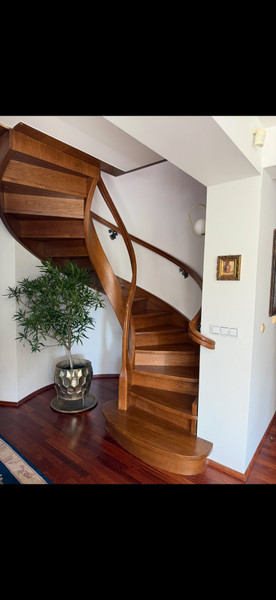Na wyższą kondygnację prowadzi nietypowa, okrągła klatka schodowa z elegancką balustradą.