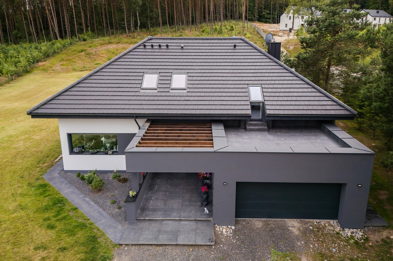 • Dachówka Creaton Simpla Nuance (antracyt), nachylenie 35°, wysokość budynku 8,34 m
