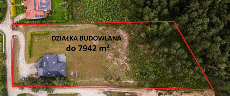 • Powierzchnia 7 942m², z czego 6 295m² stanowi teren budowlany, a 1 647m² zalesiony