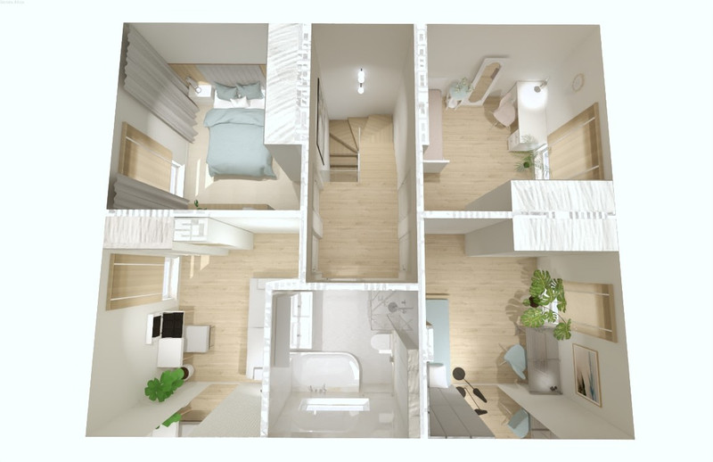powierzchnia poddasza 55,51 m2 (korytarz 4,58 m2, pokój 11,44 m2, pokój 10,61 m2, pokój 11,80 m2, pokój 11,38 m2, łazienka 5,70 m2)