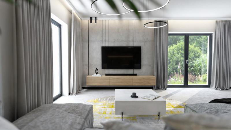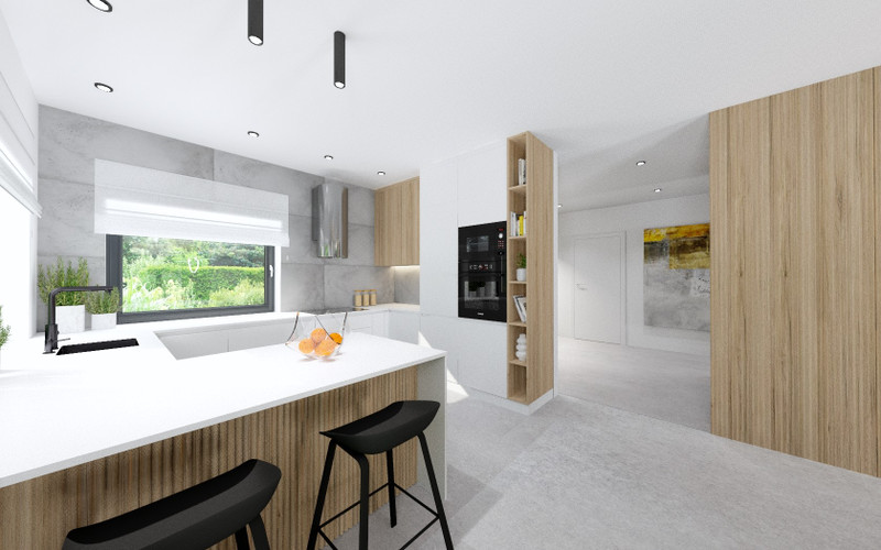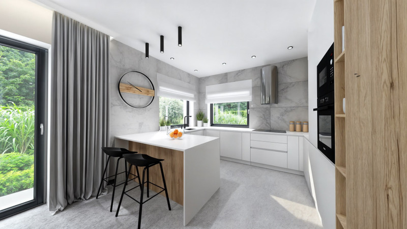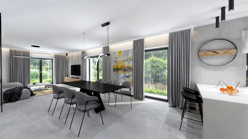 Budynek o nowoczesnej bryle z dachem dwuspadowym, w układzie "M" posiada bardzo duże okna do podłogi w całym domu, które pięknie doświetlają przestronne, jasne wnętrza.