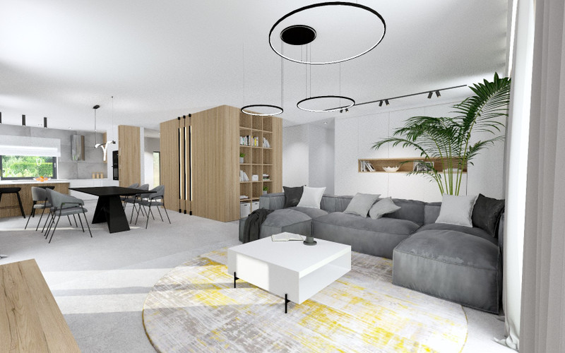 Zapraszamy do obejrzenia WOLNOSTOJĄCEGO, nowoczesnego domu parterowego o powierzchni użytkowej 155 m2, który jest usytuowany w Radzynach (gmina Kaźmierz), w cichej i spokojnej okolicy, w sąsiedztwie lasów oraz Zalewu Radzyny, zapewniającego piękne widoki, a także możliwość aktywnego wypoczynku, spacerów, czy wędkowania.