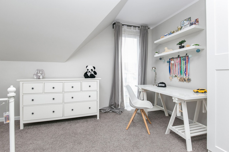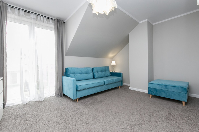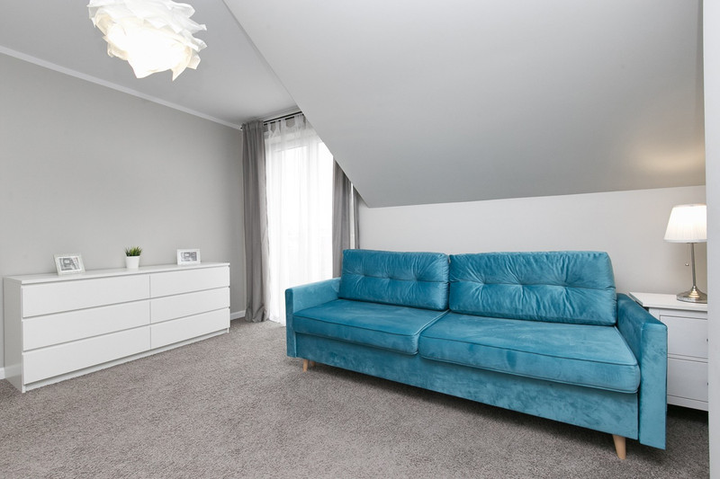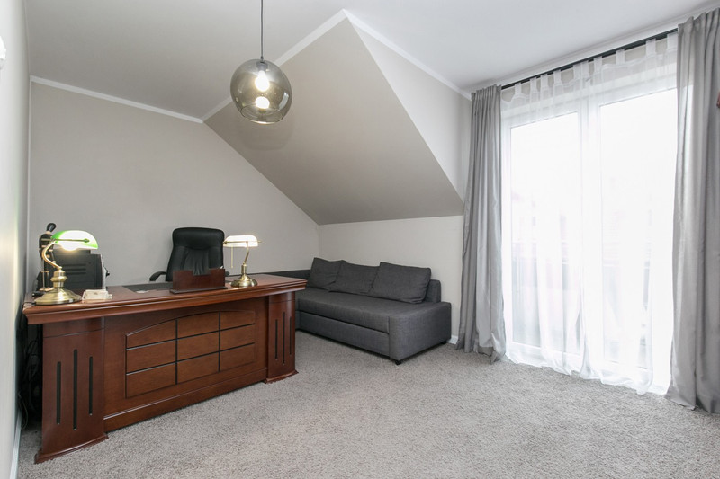 Strych o powierzchni ok. 40 m2 wykończony płytami osb jako dodatkowa przestrzeń do przechowywania stanowi doskonałą alternatywę dla piwnicy. Strych stanowi dodatkową powierzchnię i nie został wliczony do powierzchni domu.