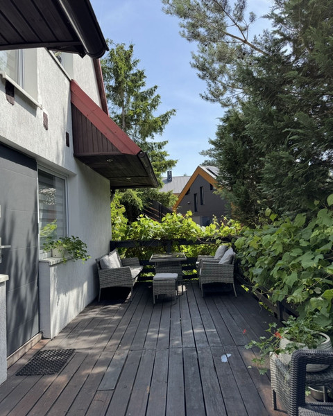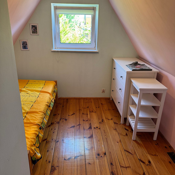 Wejście do domu stanowi drewniany taras (7. 0x2.85m) otoczony zielenią. Na parterze budynku znajduje się otwarta przestrzeń w postaci salonu wraz z aneksem kuchennym oraz łazienka. Na poddasze gdzie znajdują się 3 sypialnie oraz toaleta prowadzą drewniane schody. Na piętrze z hallu komunikacyjnego wejdziemy na strych (5.50x2.90m po podłodze) przez składane schody drewniane. Dom posiada dwie piwnice, większa z drzwiami zewnętrznymi o pow.34m2 oraz mniejsza do której wejście stanowi właz w salonie.