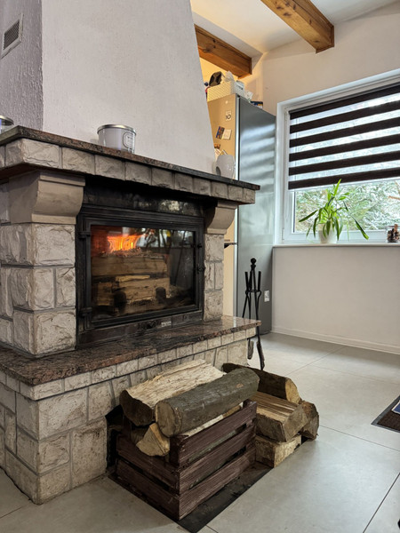 Dom ogrzewany jest za pomocą kominka z grawitacyjnym doprowadzeniem ciepłego powietrza do pomieszczeń.