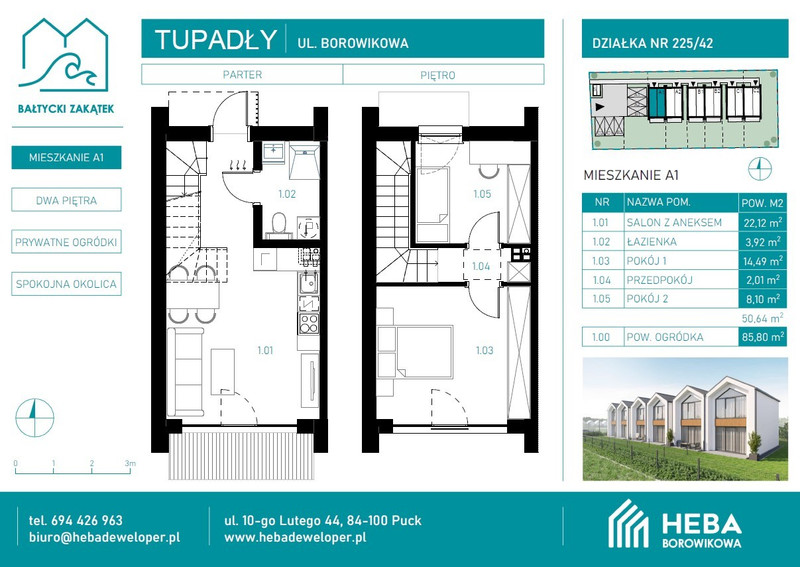 Na sprzedaż nowa, kameralna inwestycja "Bałtycki Zakątek", zlokalizowana przy ul. Borowikowej w Tupadłach, w bezpośrednim sąsiedztwie Jastrzębiej Góry. To doskonałe miejsce dla osób szukających spokoju, natury oraz bliskości morza – zarówno na własne potrzeby wypoczynkowe, jak i pod wynajem krótkoterminowy.