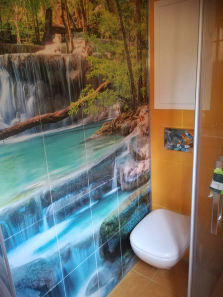 Łazienka wyremontowana- terakota, glazura z motywami, prysznic, ustęp