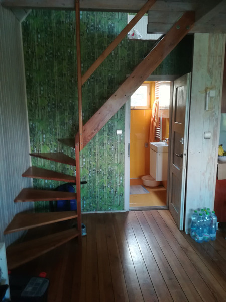 Domek w uposadowieniu ma 24 m² w ziemi znajduje się beotono-murowany garaż na którym uposadowiony został domek mieszkalny (parter i poddasze ) drewniany w sumie ponad 70 m² + b.bgospodarczy ok.8m².