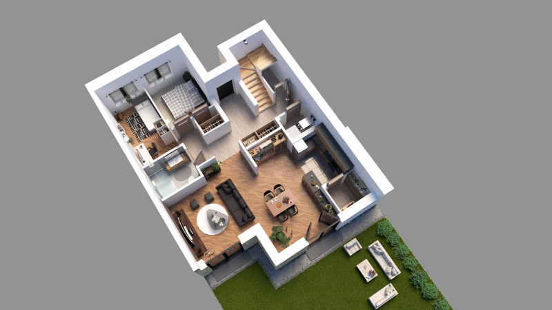 Dom zaprojektowany został z najwyższą dbałością o detale – minimalistyczna, ponadczasowa forma architektoniczna współgra z dużymi przeszkleniami, które otwierają wnętrze na otaczający krajobraz. Naturalne światło oraz płynne przenikanie przestrzeni wewnętrznej i zewnętrznej tworzą atmosferę luksusu i spokoju.