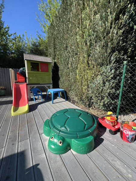 • drewniany taras na całej powierzchni ogródka (modrzew europejski) wraz z huśtawką, skrzyniami na poduszki i innymi,