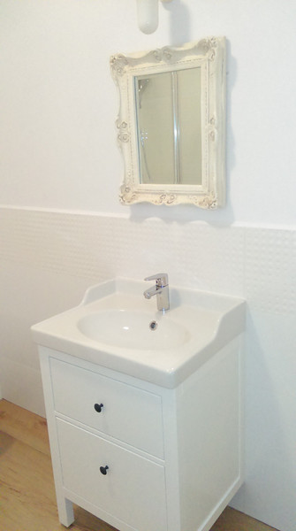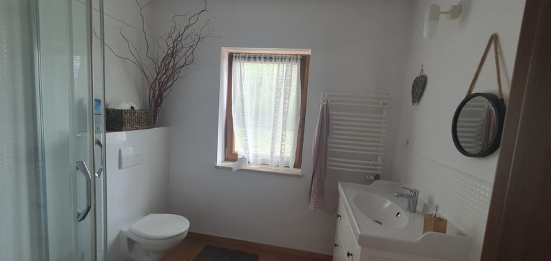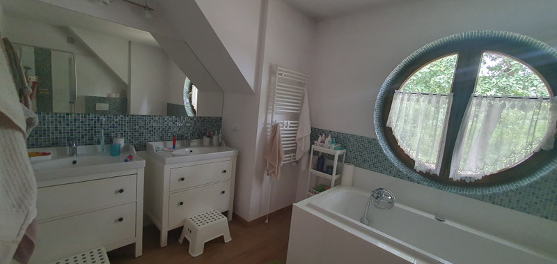 Na piętrze są trzy obszerne pokoje (19,2 m2). Dwa z nich mają okna balkonowe z balkonikami francuskimi wychodzące na ogród. Tutaj znajduje się również urokliwa, przestronna (11 m2) łazienka z dwiema umywalkami i wanną pod okrągłym oknem, przez które widać nasze wysokie dęby. Trzeci pokój jest mniejszy (10 m2) z oknem w dachu.