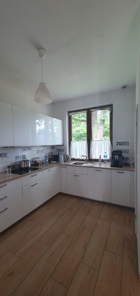 Po prawej stronie od wejścia nowoczesna kuchnia (10,4m2) z obszerną spiżarnią (1,9m2), po lewej przejście do łazienki i dalej do garażu (na 2 samochody), schody na górę i zejście do piwnicy - w pełni funkcjonalnego piętra z ogrzewaniem podłogowym, świetnie nadającego się na kino domowe z prawdziwego zdarzenia. W osobnym pomieszczeniu pralnia i kotłownia z nowoczesnym kotłem gazowym.