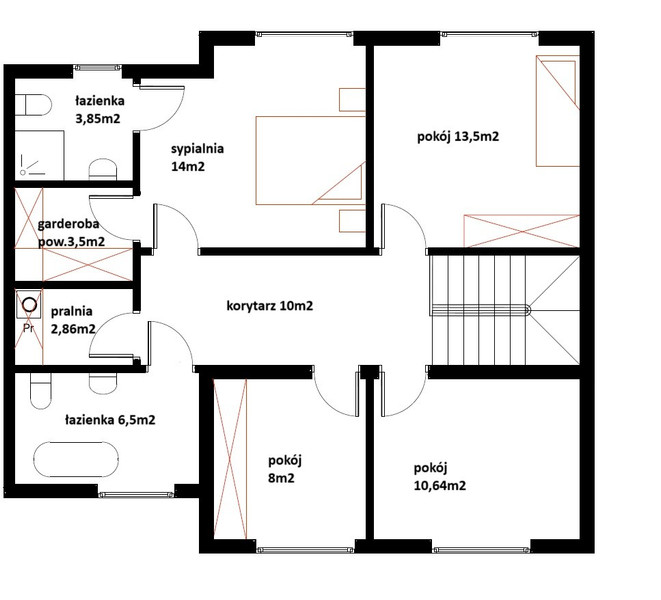 Piętro: Sypialnia z własną garderobą i łazienką, 3 pokoje, łazienka oraz pralnia.