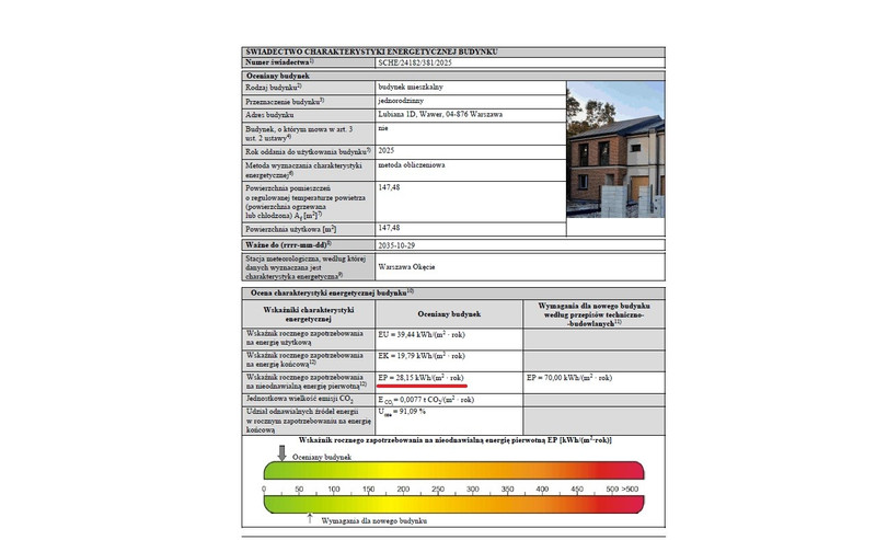 Wszystkie użyte materiały sprawiły, że budynek ma niesamowicie dobre współczynniki - wymagania dla nowych budynków to EP = 70,00 kWh/(m2 · rok) nasze domy mają EP = 28,15 kWh/(m2 · rok)