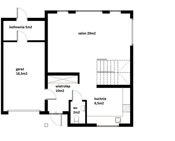 Parter: przestronne wejście z miejscem na dużą szafę, toaleta, schowek pod schodami, półotwarta osobna kuchnia, salon z jadalnią i wyjściem na ogród. Na parterze znajduje się dodatkowo garaż jednostanowiskowy oraz kotłownia.