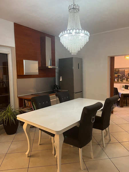 Z korytarza jest wejście bezpośrednio do otwartej kuchni, która jest w pełnej zabudowie. Bezpośrednio można wejść do salonu za pomocą przesuwanych drzwi. Do salonu można wejść też z holu. Pomieszczenie jest bardzo ustawie i oświetlone. Jest miejsce na zestaw wypoczynkowy, który można umieścić przy kominku który ma rozprowadzenie ciepła na cały dom. Jest też miejsce na duży stół w części jadalni z pięknym dużym oknem. Przy tak dużym metrażu jest możliwość dowolnej aranżacji przestrzeni.